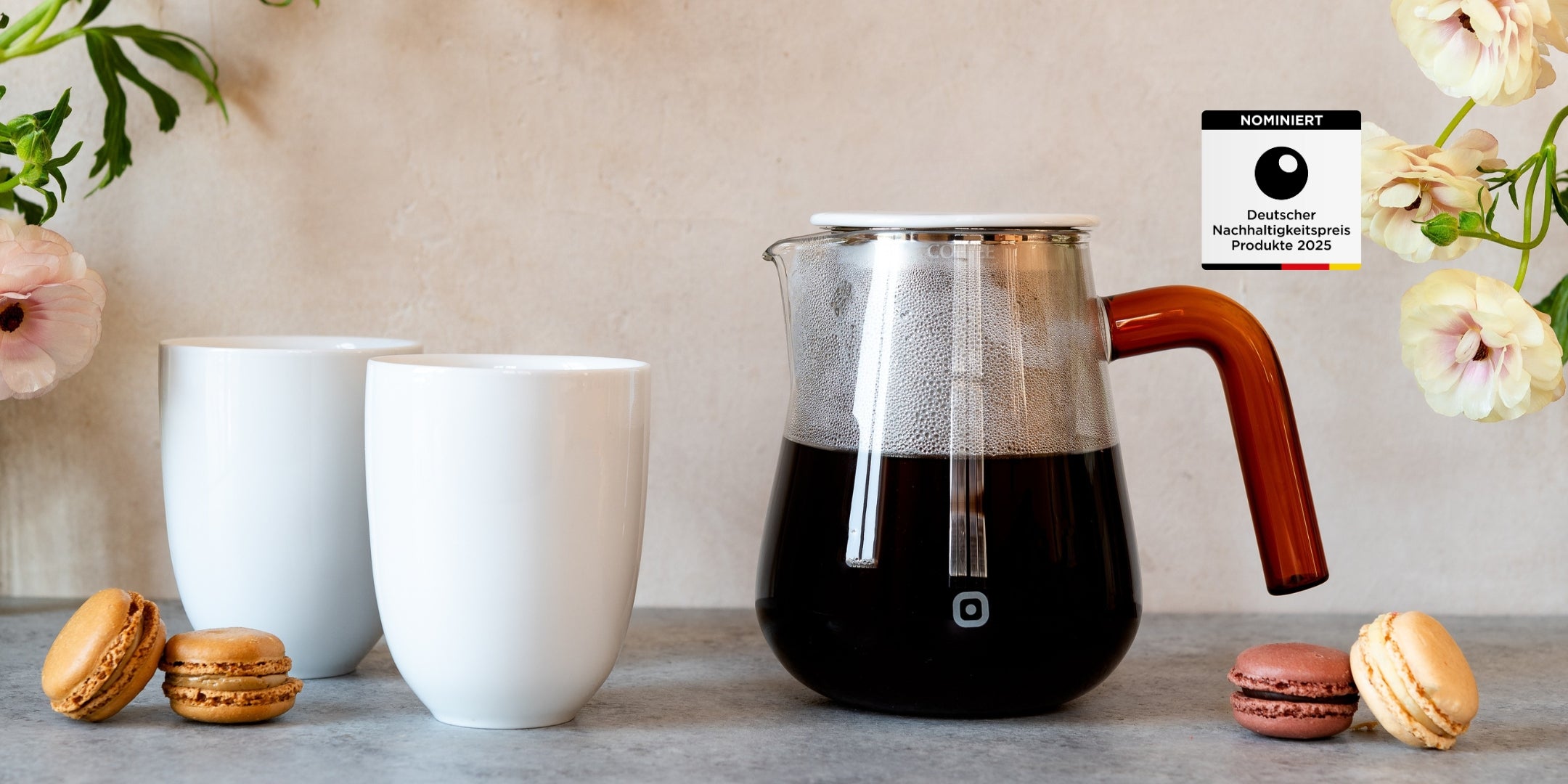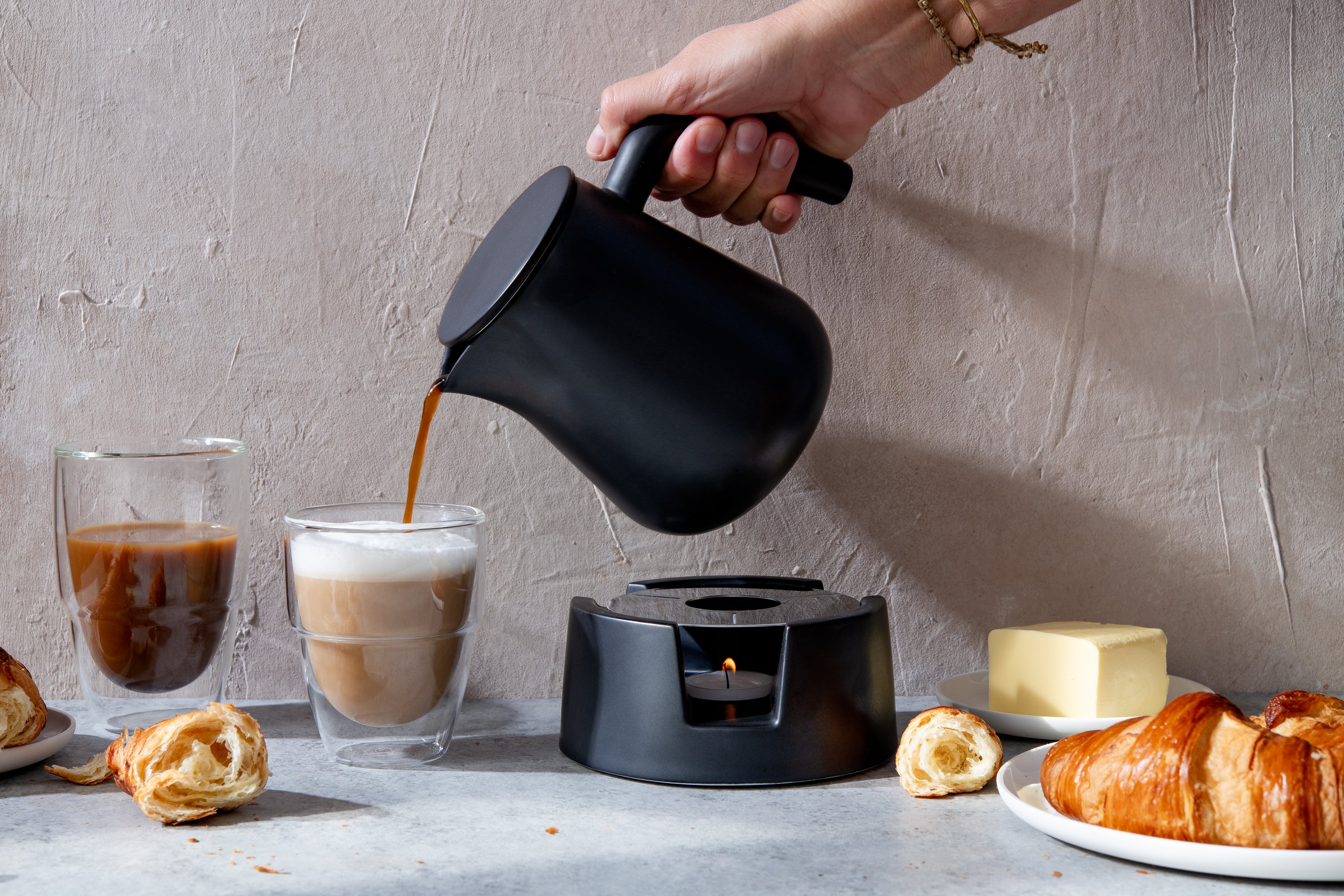 The filter remains in the pot and warms the coffee from the inside. So you can have breakfast in peace...