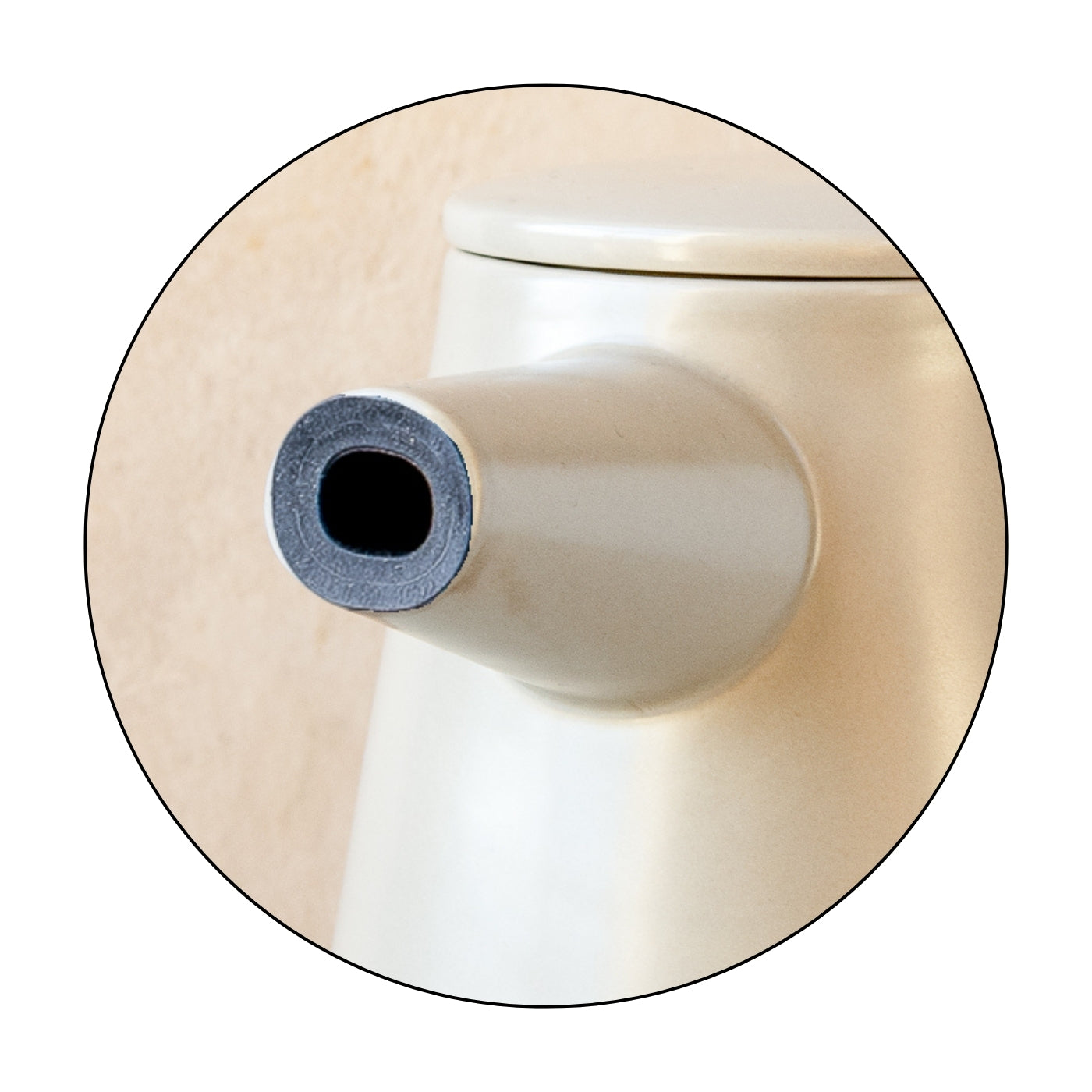- Wir haben den Griff der Porzellan Arca hohl gestaltet, damit er nicht heiß wird und dennoch stabil bleibt. Er hat ein kleines Loch an der Unterseite, durch das gelegentlich Wasser eindringen kann, aber problemlos abläuft.